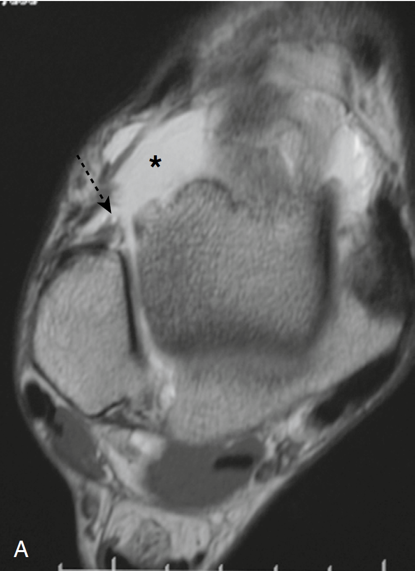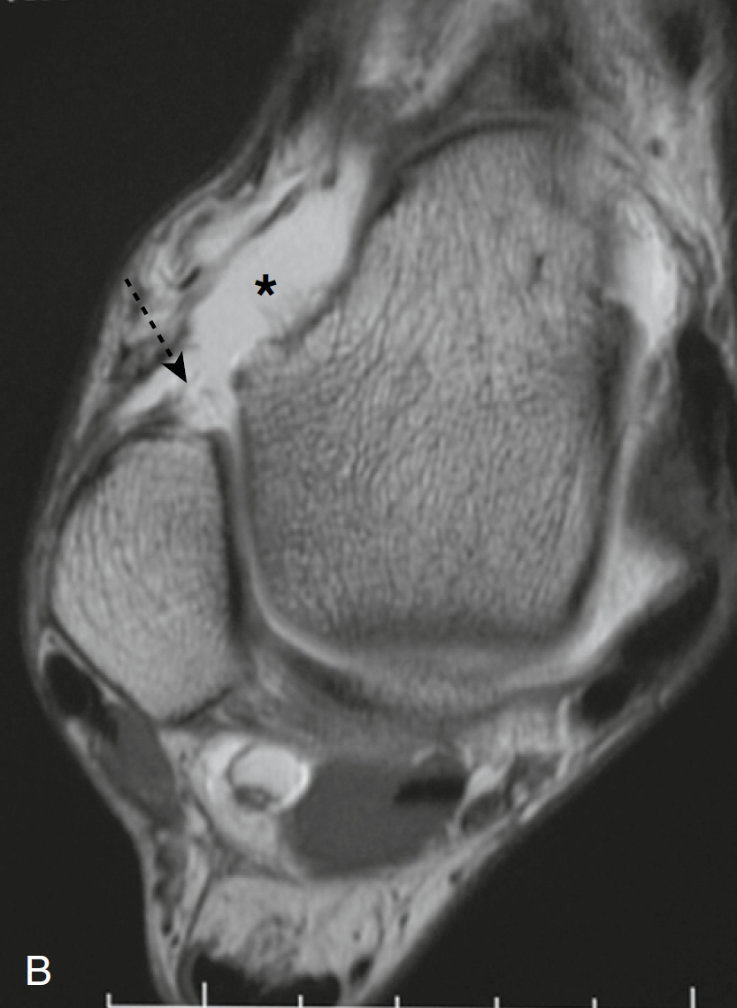 图2(A与B)连续轴位T1加权MR关节造影图像显示:距腓韧带完整断裂,只有一小近端残留物(虚箭头)。比正常关节部呈高信号(星号)