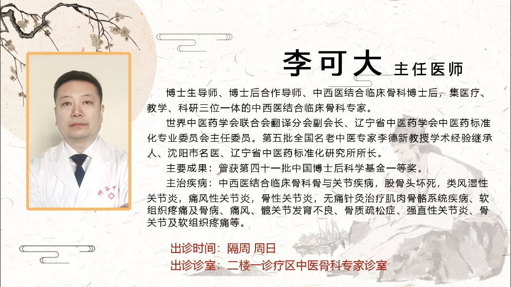 博士生导师、博士后合作导师、中西医结合临床骨科博士后,集医疗、教学、科研三位一体的中西医结合临床骨科专家。世界中医药学会联合会翻译分会副会长、辽宁省中医药学会中医药标准化专业委员会主任委员。辽宁省中医药标准化研究所所长。主要成果:曾获第四十一批中国博士后科学基金一等奖。主治疾病:中西医结合临床骨科骨与关节疾病,股骨头坏死,类风湿性关节炎,痛风性关节炎,骨性关节炎,无痛针灸治疗肌肉骨骼系统疾病、软组织疼痛及骨病、痛风、髋关节发育不良、骨质疏松症、强直性关节炎、骨关节及软组织疼痛等。