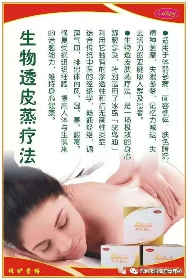乐利来透皮冰火蒸疗独特的功效,大量的临床所证实,主要表现在。疏通经络,平衡阴阳,活化全身细胞激活全身机能,去除体内的风,湿,寒、邪、毒、热等毒素,它有病治病,无病强身的功效。