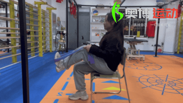 ②保持你的腿伸直,慢慢地向后伸直你的腿。保持1~2秒。慢慢回到起始位置。重复,然后换另一侧。注意:当你用力时,一定要反复检查弹力带是否松动,不要因为弹力带断裂而伤到你。