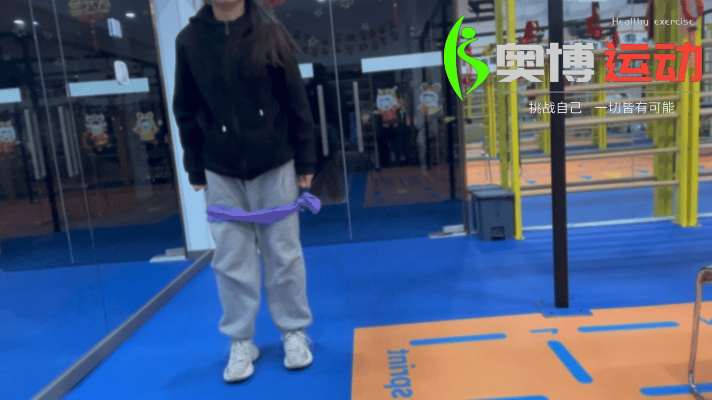 ①双脚分开站着相距15厘米,用环形弹力带在大腿中间的位置围一圈,或者用扁状弹力带在大腿上绕一圈系上。