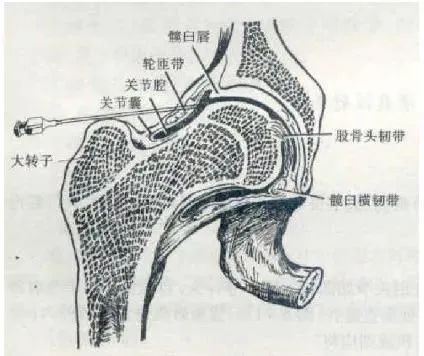 患者侧卧位,患侧在上。在股骨大转子尖上方为穿刺点。皮肤常规消毒,用7号长穿刺针刺入,并徐徐沿股骨颈上缘骨面向上方髋臼进入,至髋臼关节囊外,回抽无回血后,即可注射少量药液;再继续进针穿过关节囊进入关节腔。