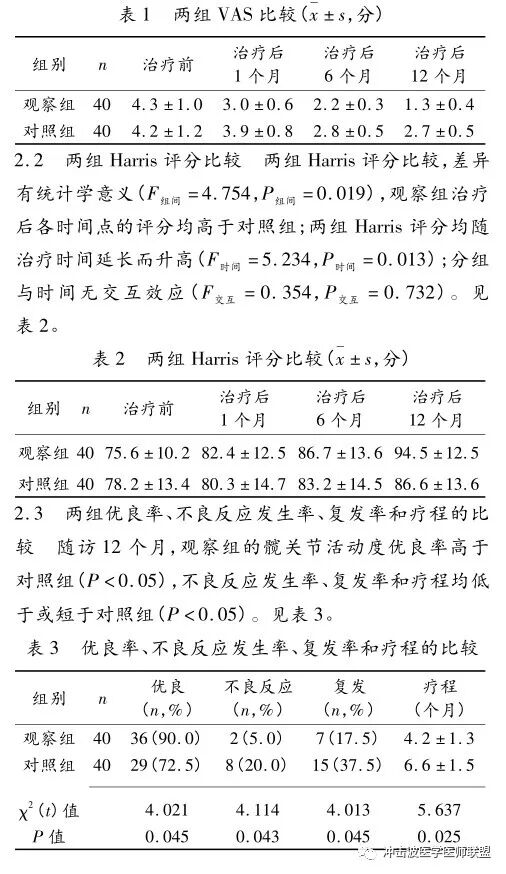 1.3 观察指标和评价标准 (1)疼痛评价:以视觉模拟评分法(Visual Analogue Scale,VAS) [2] 评估疼痛程度,分值范围为 0 ~ 10 分,分数越小痛感越低,分数越大痛感越高。(2)髋关节活动度(Harris 评分),90 ~ 100 分为优,80 ~89 分为良,70 ~79 分为中,<70 分为差。(3)髋关节活动度优良率、不良反应发生率、复发率和疗程。临床症状逐渐加重,并经实验室和影像学检查证实,则判断为疾病复发。不良反应包括局部感染、肿胀、软组织损伤等。