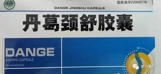 16、丹葛颈舒胶囊0.3g*24粒 成份:黄芪,党参,当归,丹参,赤芍,桃仁,红花,川芎,地龙,葛根,细辛,甘草。功能主治:益气活血,舒经通络。用于瘀血阻络型颈椎病引起的眩晕,头昏,颈肌僵硬,肢体麻木等。口服。一次3粒,一日3次