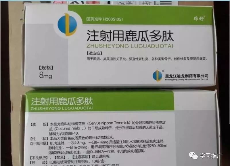 3、鹿瓜多肽针8mg 黑龙江 适用于风湿,类风湿性关节炎,骨折的早期愈合,骨关节炎,腰腿疼痛及创作恢复等,静脉滴注给药时,本品宜单独使用,不宜与其他药物同时滴注