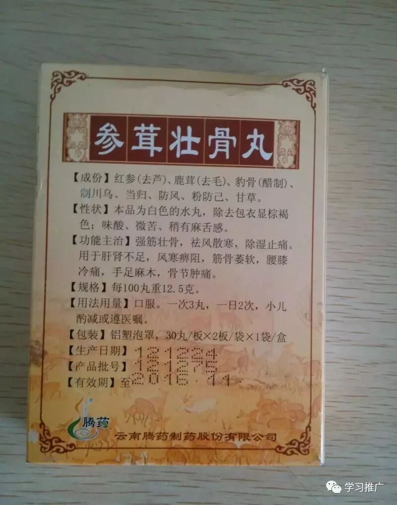 12.参茸壮骨微丸一2次,10天量 口服,一次3丸,强筋壮骨,祛风散寒,除湿止痛.用于肝肾不足,风寒痹阴,筋骨萎软,腰膝冷痛,手足麻木,骨节肿痛. 含有天然金钱豹骨(厂家原库存),人参和鹿茸。绝版药物以后不再有。适用老年体虚骨病患者