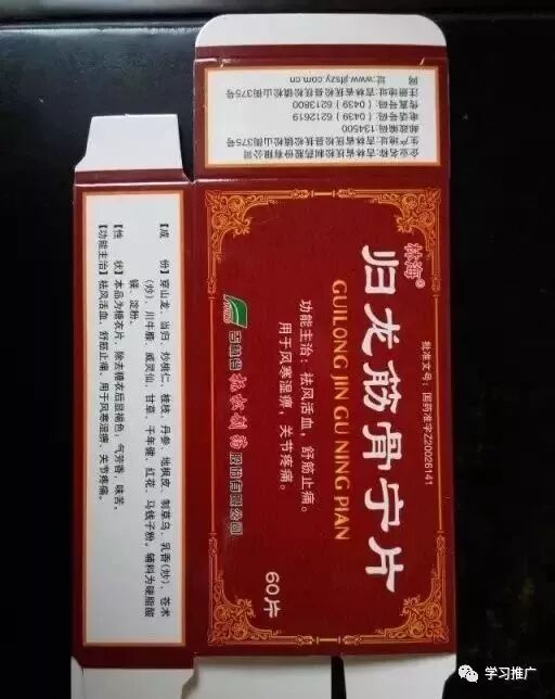 4.归龙筋骨宁0.25g*60片祛风活血,舒筋止痛。用于风寒湿痹,关节疼痛。口服,一次2片,一日1~2次。一个月量大包装。成 份:穿山龙、当归、桃仁(炒)、桂枝、丹参、地枫皮、制草乌、乳香(炒)、川牛膝、威灵仙、甘草、千年健、红花、马钱子(制)、硬脂酸镁、淀粉