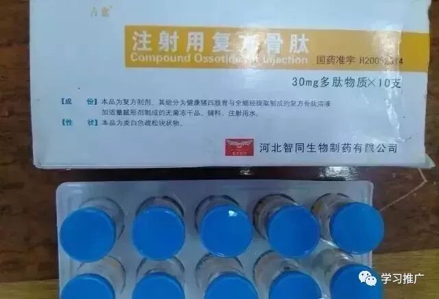 4、复方骨肽针30mg 粉针骨肽注射液是由新鲜或冷冻的猪或胎牛四肢骨提炼而成劣质骨肽针等同于安慰剂,而复方骨肽注射液由健康猪四有,再添加全蝎提取而成