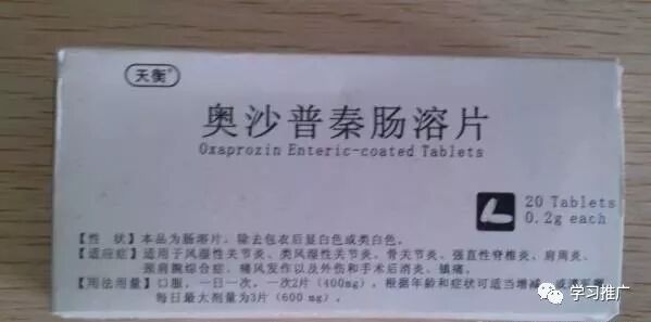 6、奥沙普秦肠溶片0.2g*20片/ 300盒/件 厂家:宁波天衡 适用于风湿关节炎、类风湿性关节炎、骨关节炎、强直性脊椎炎、肩关节周围炎、颈肩腕症候群、痛风及外伤和手术后消炎镇痛。口服,一次0.2~0.4g(1~2片),一日一次,连续服药1周以上或遵医嘱,饭后服用,最大剂量一日0.6g(3片)