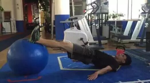 练习者仰卧位,双脚搭在瑞士球上作支撑,腰背挺直,注意挺髋,使髋膝踝肩在一条直线上,保持60秒,每次做三组。
