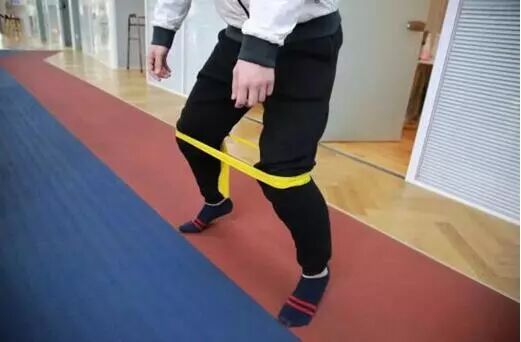 弹力带抗阻进行侧滑步,弹力带位置在膝盖上下,注意臀肌发力,减少阔筋膜张肌的代偿,侧滑走10米。