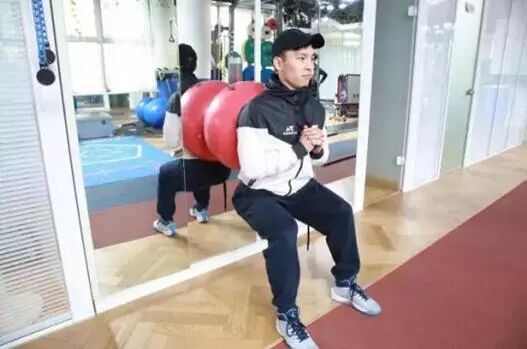 靠球静蹲动作要求两脚分开与肩同宽,膝关节约呈90°,股骨、胫骨与脚尖在一条直线上,膝关节不要内扣,开始时用力向后顶球。40s为一组,每次做三组 。