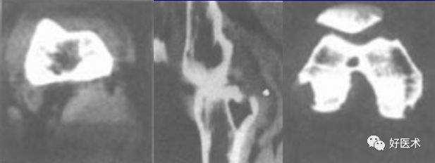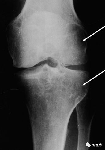 第二期:滑膜炎表现,髌上囊肿胀,因关节积液为血性,故密度稍高;接着出现骨腐蚀和囊性变——实际上是结节在骨软骨上的压迹,以发生在髋关节最为多见;