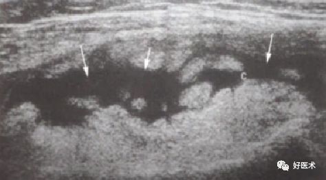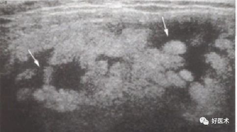 (3)关节外病变:周围软组织内有结节状或分叶状不均质回声区