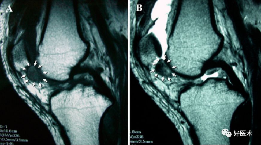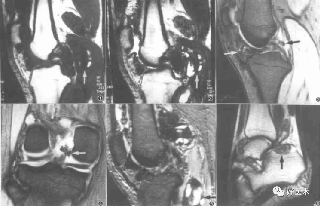 MRI对膝关节PVS具有定性诊断意义,它可以清楚显示病变的范围、关节软骨及骨质破坏的程度,其特征性表现为T1、T2加权像时低密度信号区。故MRI已成为X线片检查后首选的影像学检查方法。术前MRI检查不仅有助于明确关节内、外病变程度和范围,同时,术后MRI检查也是检查病变复发与否的最敏感手段。