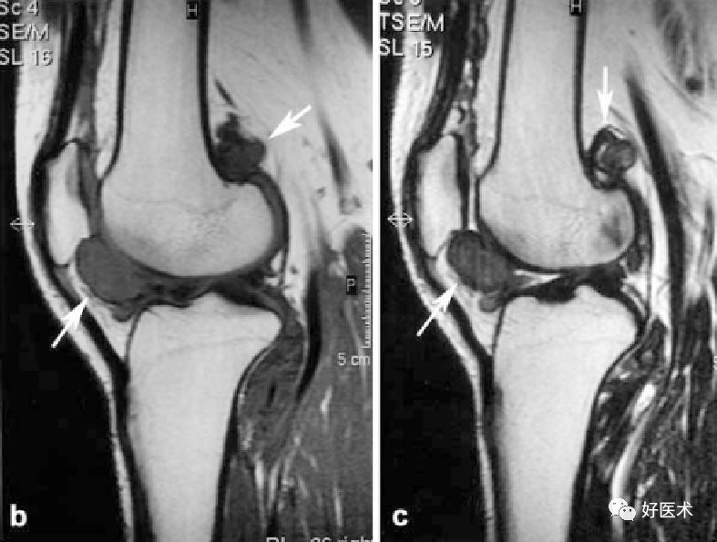 髌上囊内液性暗区,滑膜不同程度增厚,呈结节状