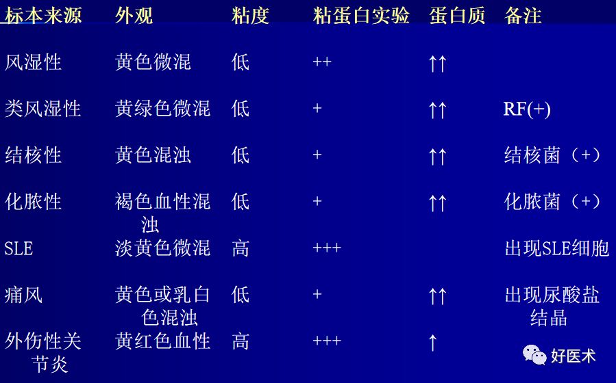 对本病的诊断极为重要。关节抽出液多呈黄褐色或暗红色,稀薄而有黏性,含红细胞,结核菌及细菌培养阴性;当然关节液的色泽与滑膜的病理类型及病变发展阶段有关,如滑膜病变为局限型结节状,其关节液颜色可正常或淡黄色