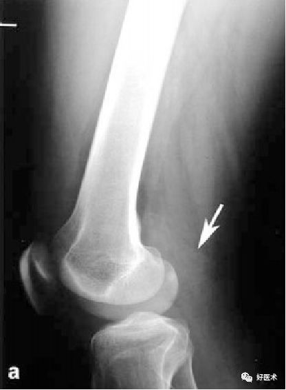 第三期:进展期,滑膜上有多个软组织结节形成,虽未钙化,但含铁血黄素的密度高,在X线片往往可以显示出结节上轮廓,具有诊断价值。