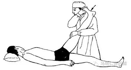 1、 仰卧位,膝关节伸直,以法在髌上方操作,以指揉或掌揉法在髌下,内、外侧操作15分钟。