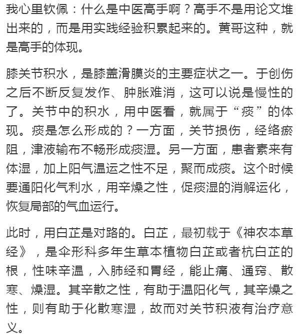 今天在这里,我就给你说一个,调治膝关节滑膜炎、关节积液的办法。这就是妙用中药白芷。