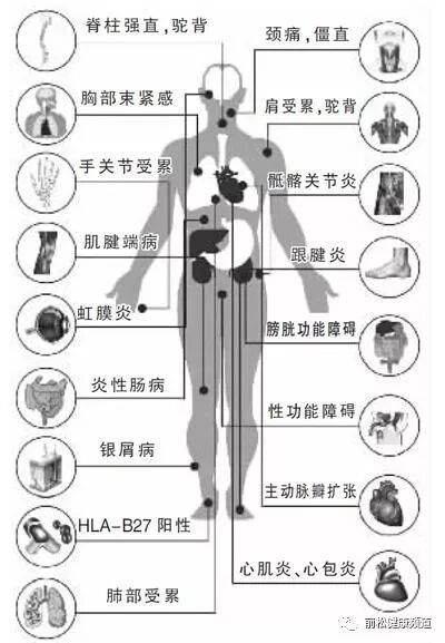 本病的全身表现轻微,少数重症者有发热、疲倦、消瘦、贫血或其他器官受累。跖底筋膜炎、跟腱炎和其他部位的肌腱端病在本病常见。神经系统症状来自压迫性脊神经炎或坐骨神经痛、椎骨骨折或不全脱位以及马尾综合征,后者可引起阳萎、夜间尿失禁、膀胱和直肠感觉迟钝、踝反射消失。极少数患者出现肺上叶纤维化,有时伴有空洞形成而被误认为结核,也可因并发霉菌感染而使病情加剧。主动脉瓣闭锁不全及传导障碍见于3.5%~10%的患者。AS可并发IgA肾病和淀粉样变性。