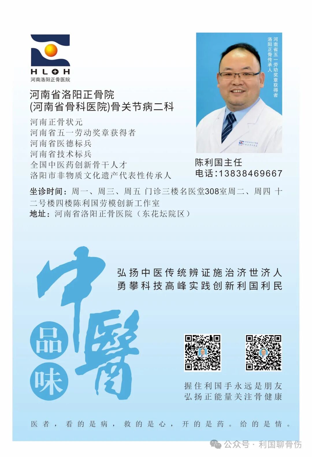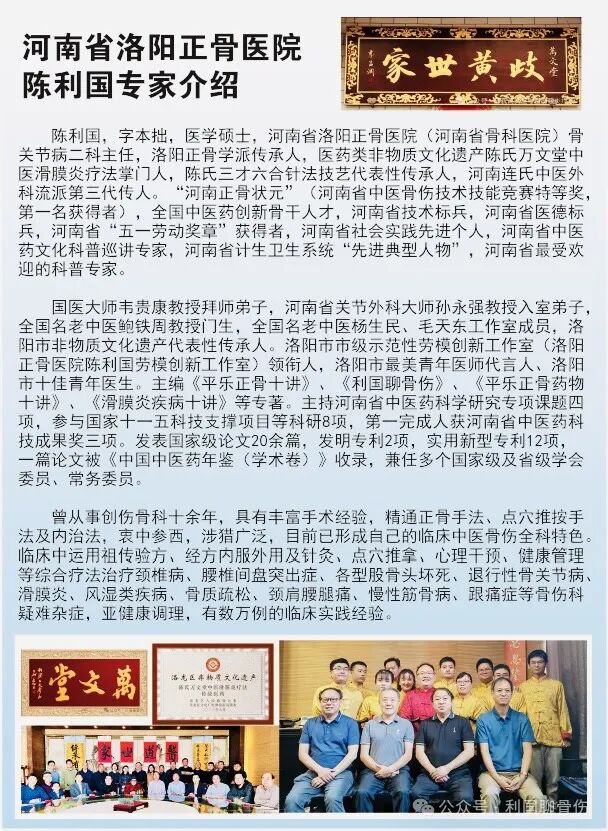 陈利国,医学硕士,副主任中医师,洛阳白马寺镇人,出生于洛阳东郊陈家屯村陈氏家族,家族医学医道传承自清代至今,自幼受医学文化熏陶,百年学府洛阳一高毕业后,因崇拜洛阳正骨历史文化绝技,立志从事中医正骨事业,结合家传医道,为病家解除痛苦。考入河南中医学院骨伤专业学习,在校五年期间,刻苦钻研,勤求古训,遍访名师,博采众长,精研恩师周民强教授传授的民国《正骨心法》,以优异成绩毕业,凭品学兼优入职河南省洛阳正骨医院工作。
