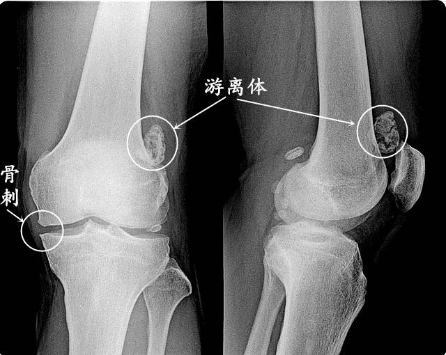 关节肿胀、疼痛比较显著,并伴有积液、骨刺、游离骨。