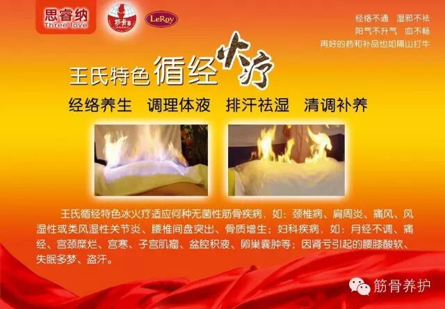 王氏阴阳火疗:冰火两重天,其魅力所在,是快速打通人体经路,排除体内风,寒,湿,毒。有修复骨细胞,达到再生。再建,再补之功效。利用开水和冷水解冻肉之原理,开水解冻肉冷气往里逼表皮烫熟了,冷水解冻肉是冷气向外排,王氏特色冰火疗就是利用这一原理,它是祖传中医世家传人,王凯荣教授辛勤研发,并获得专利,给广大骨病患者带来福音,让天下父母行动自由。