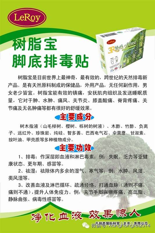 脚底排毒贴来自日本,最轻松、快速、有效的排毒保健新疗法研发者自人类开天辟地以来,森林的树木就凭自身的生存本能吸取天地精华,成长千年百载。凭借树木的自然奥秘力量和原理,日本树液能量研究会会长松下高雄博士与川濑逸子医生耗尽26年的心血研究,终于成功将树液的摄取和排毒功能,应用在人体物理治疗上,且取得惊人的突破性成果。排毒原理:人体有365个穴位,脚底占了60个穴位,是人体五脏六腑的反射区,也是人体毒素流经聚散的枢纽。脚底排毒贴吸取树液之精华,发挥天然摄取功能。将树脂宝轻松贴在脚底,当身体的血液运行到脚底时,它的树液成份可将积存在人体内的毒素一一吸出,达到排毒效果。