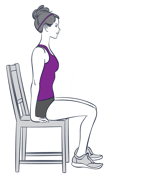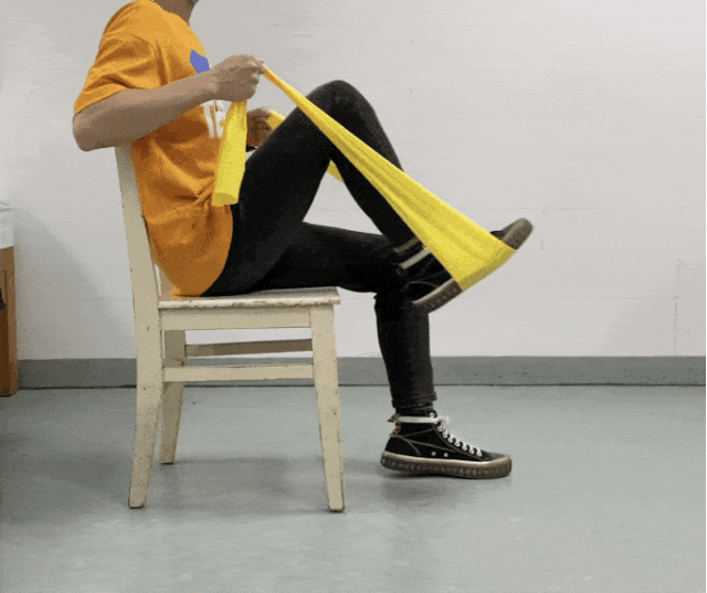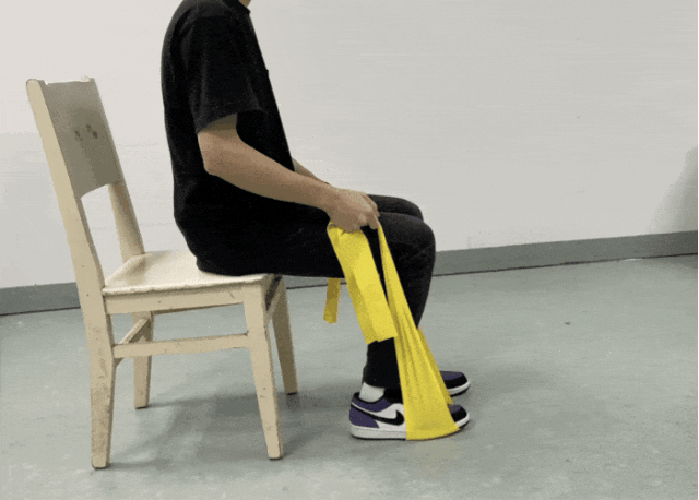 坐在稳定的椅子边上,双脚平放在地板上。在右脚脚底放置一条弹力带,每只手握住弹力带的一端。用鼻子深吸气,伸直右腿。现在通过你的嘴唇呼气,试着把你的右腿在舒适的情况下尽可能伸直,保持这个姿势一会儿。