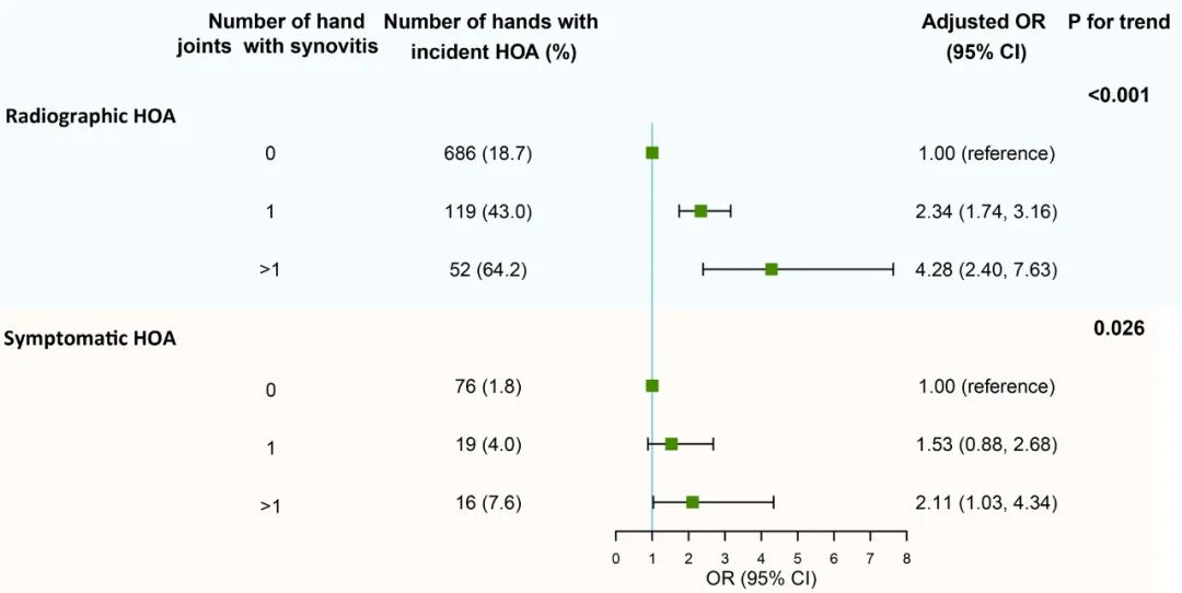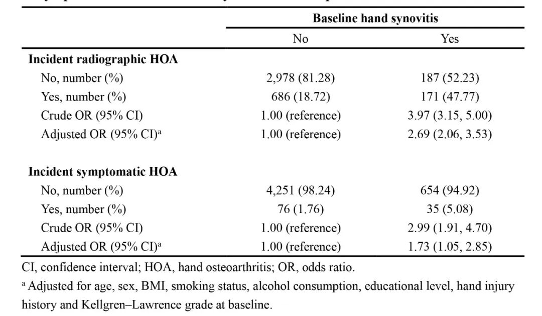 研究分别纳入4,022只放射学HOA(2280名参与者)的手和5,016只症状性HOA(2280名参与者)的手(图1)。在3年的随访中,857(21.3%)只手出现偶发性HOA,111(2.2%)只手出现症状性HOA。如表1所示,基线手滑膜炎与影像学HOA(OR=2.69,95% CI: 2.06-3.53,P<0.01)和症状性HOA(OR=1.73, 95% CI:1.05-2.85,P=0.03)的风险增加相关。