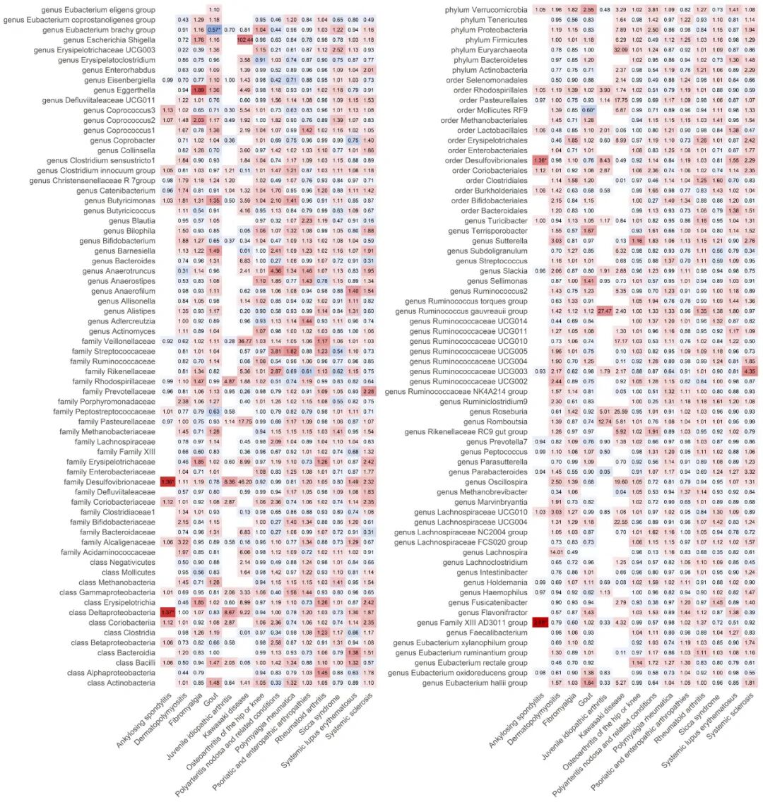 141种肠道微生物群与14种风湿病相关性的孟德尔随机化结果