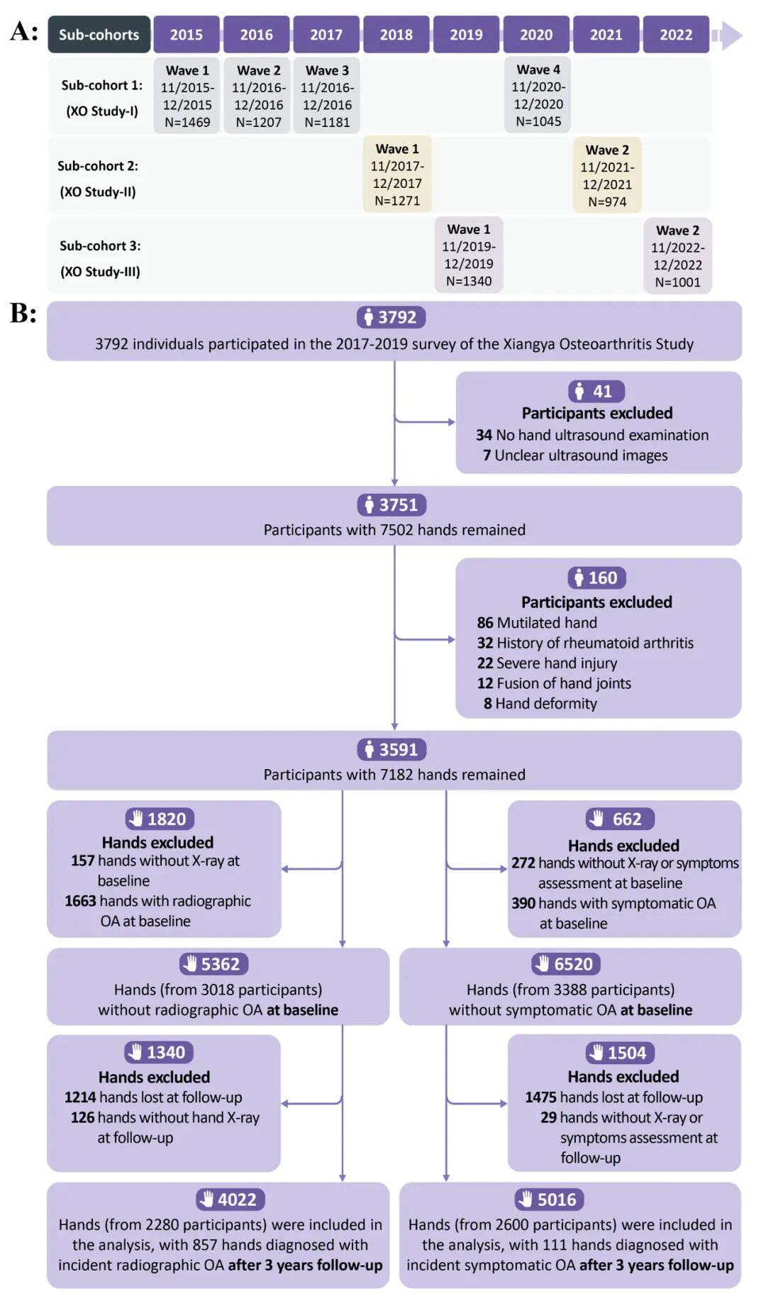 图1 (A)湘雅骨关节炎研究(XO研究)检查周期图;(B)新发放射学或症状性HOA研究参与者筛选流程图