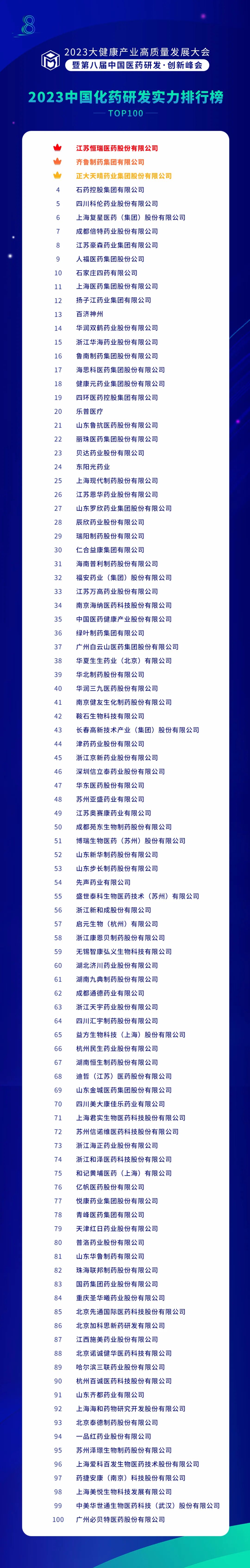 《化药榜》前三名分别为恒瑞医药、齐鲁制药、正大天晴;这也是恒瑞医药连续四年摘得化药榜桂冠,齐鲁制药排名再次上升,位居第二;