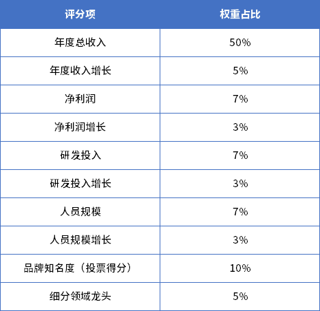 本排行榜根据业务方向分为《2023中国医药CRO企业20强》和《2023中国医药CDMO企业20强》。排行榜评分涉及多个指标,包括年度总收入(营业总收入)、年度收入增长(%)、净利润、净利润增长(%)、研发投入、研发投入增长(%)、人员规模、人员规模增长(%)、品牌知名度(投票得分)、细分领域龙头等10项指标,各指标占比如下表所示,上市企业直接调用年报数据,非上市公司由企业提交数据并经专家委员会确认。
