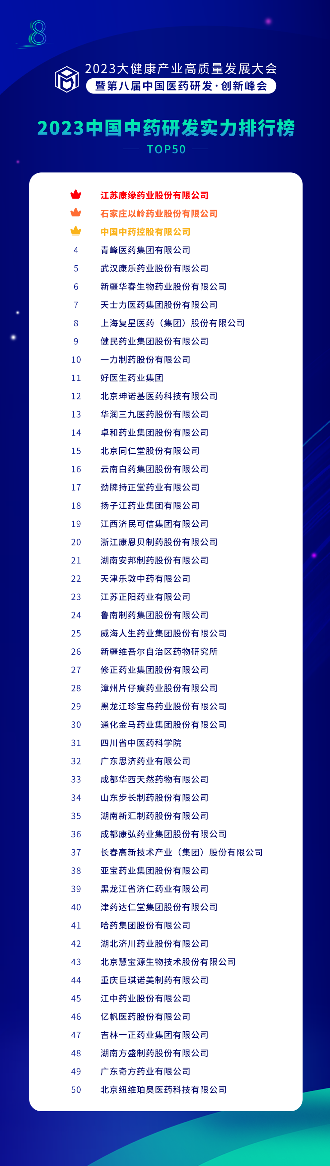 《中药榜》前三强分别为康缘药业、以岭药业、中药控股。其中康缘药业再次夺得榜首,中药控股进入前三;