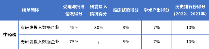 注:历史排行榜得分项中,2022中国中药研发实力排行榜得分占6%,2021中国中药研发实力排行榜得分占4%。