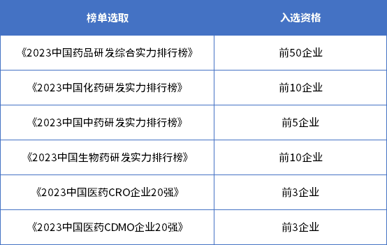 《2023中国医药创新领军人物奖》依据《2023中国药品研发综合实力排行榜》《2023中国化药研发实力排行榜》《2023中国中药研发实力排行榜》《2023中国生物药研发实力排行榜》《2023中国医药CRO企业20强》《2023中国医药CDMO企业20强》6个排行榜排名,并选取排名前列的获奖企业获得入选资格。