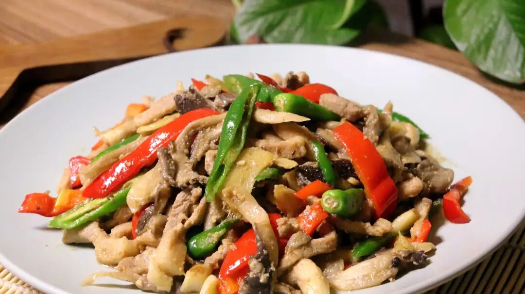 准备食材:平菇、肥膘肉、青红辣椒、姜蒜。
