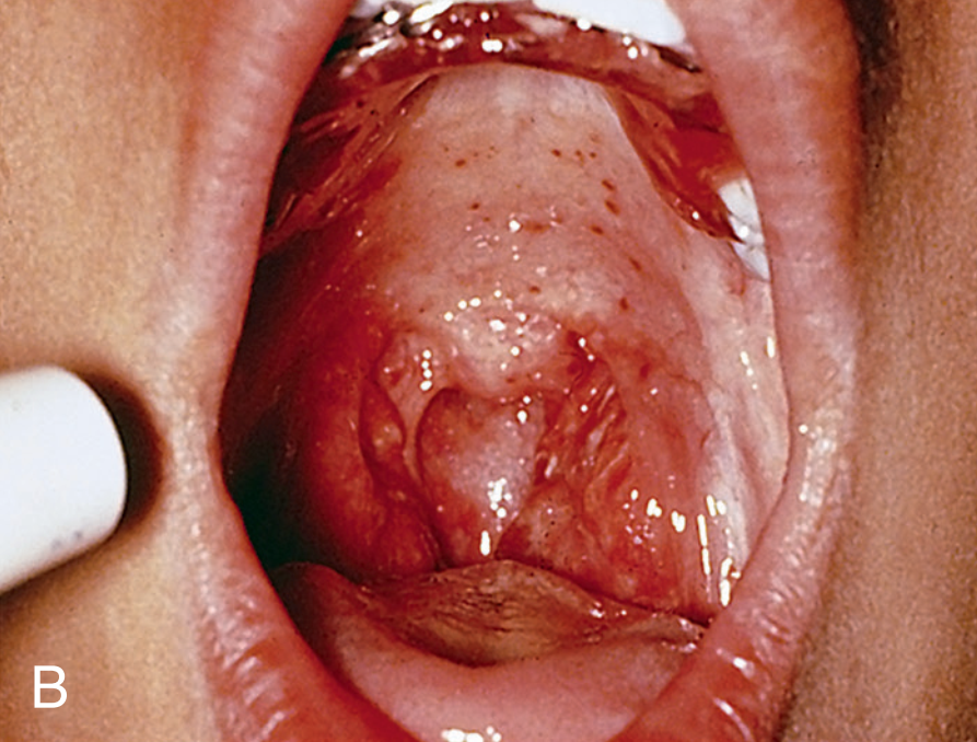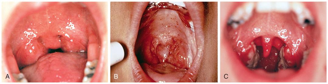 部分扁桃体炎患儿的特殊体征对诊断有提示作用,比如,扁桃体炎患儿口腔上颚若出现瘀点可提示链球菌感染(如下图B)。