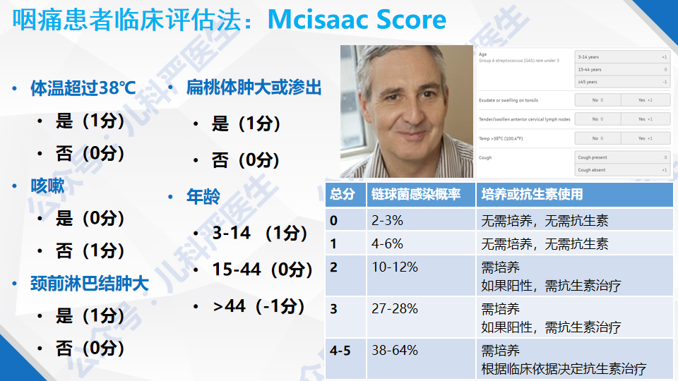 麦克伊萨克评分 (Mcisaac score)也可提供一些有价值的参考,比如分值越高,链球菌感染可能性越大。但这个评分也只能用于3岁以上咽痛患儿的评估,精确性也存疑。
