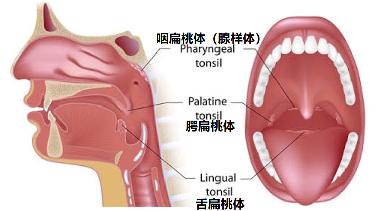其实除了腭扁桃体,扁桃体还包括咽扁桃体(也就是腺样体)和舌扁桃体,但眼睛无法直视它俩。
