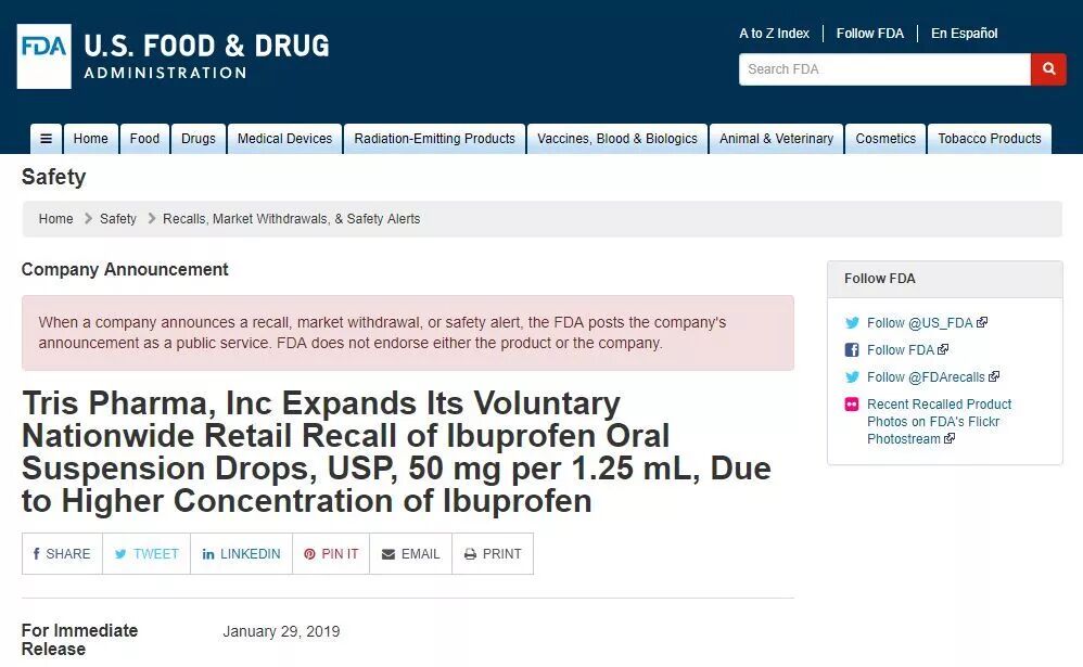 其实早在今年1月份,美国食药监局官网发布了一条召回布洛芬的公告。但召回的只是部分批次。