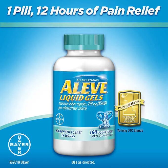 Aleve 的有效成份是 Naproxen,是美国卖最好的止痛药、退烧药,因为它的药效可以持续12个小时,不会成瘾,也不会嗜睡,而且比其他止痛药的副作用还来得低,就连正在哺乳的妈妈也可以安全的使用。一般药局都有卖自家的 Naproxen Sodium Tablet ,他的功效与 Aleve 一样,但价格可能会比 Aleve 来得便宜许多。