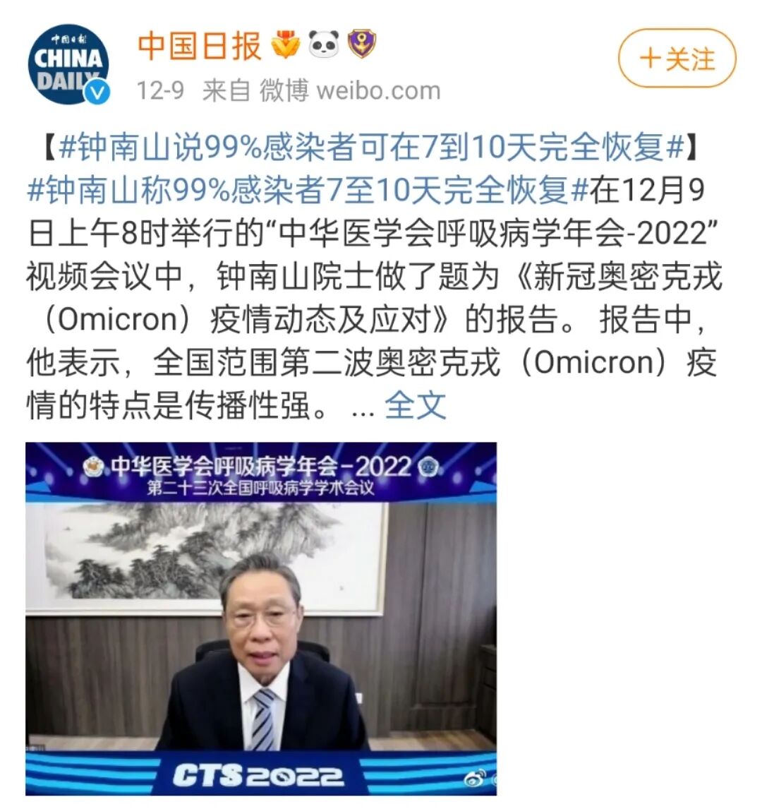 钟南山院士说,现在奥密克戎的致病率大大减弱,99%可在7-10天内完全恢复。