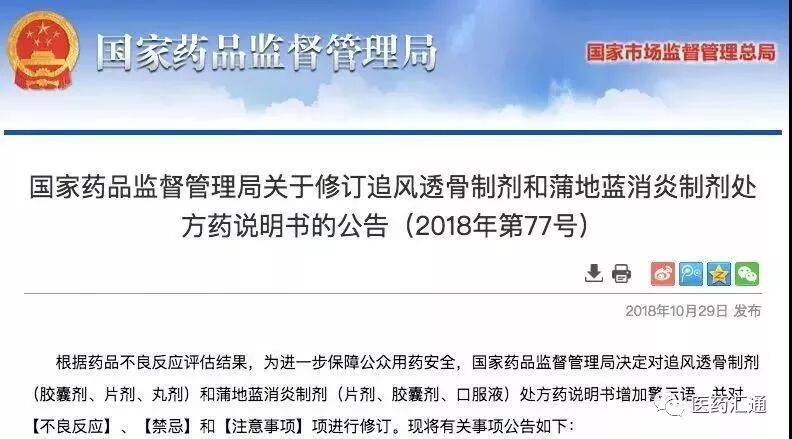 10月29日下午,国家药监局发布《关于修订追风透骨制剂和蒲地蓝消炎制剂处方药说明书的公告(2018年第77号)》。