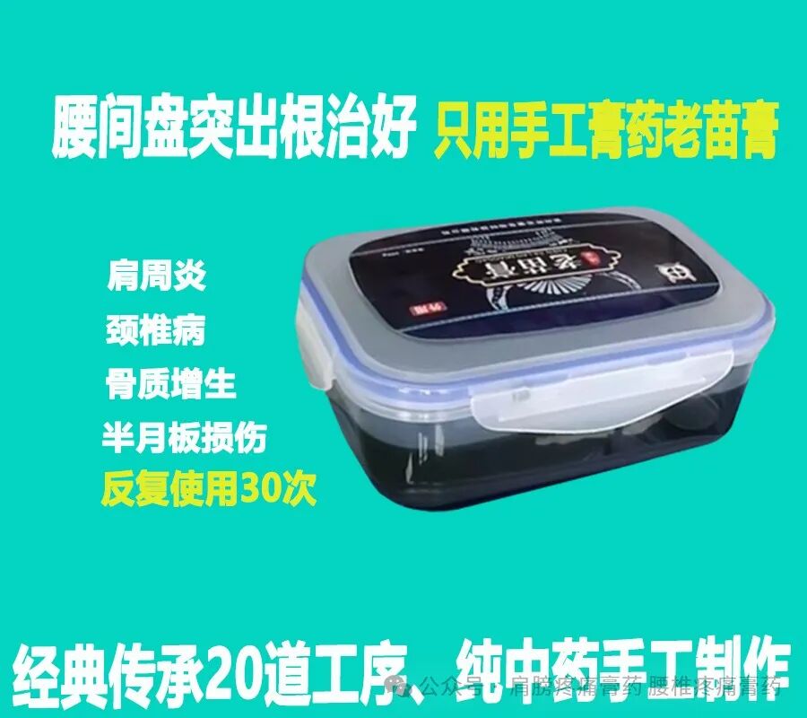 我是苗族膏药传承人,主要经营:腰椎间盘突出膏药,颈椎间盘突出膏药,腰肌劳损膏药、乳腺增生膏药,腱鞘炎膏药,肩周炎膏药,膝盖半月板损伤膏药,风湿关节炎膏药。腰椎劳损退变、腰间盘膨出、骨质增生、坐骨神经痛。