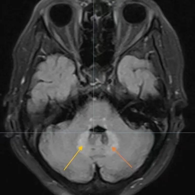 67岁张女士,1月余前无明显诱因出现头晕,症状呈持续性,感行走不稳,视物模糊、恶心。一直未予在意,直到多次出现跌倒才引起重视,遂前往我院神经内四科门诊就诊,并收住院治疗。住院后抽血完善各项化验指标均未见明显异常。完善颈部血管彩超、双下肢血管彩超均无特殊表现。查头部磁共振平扫提示脑内多发缺血及腔隙性梗死灶(慢性期);桥脑及小脑齿状核变性灶;头颈部血管均未明显狭窄。初步考虑是桥脑、小脑病变所致,但仍不能明确是什么原因导致了桥脑、小脑病变。