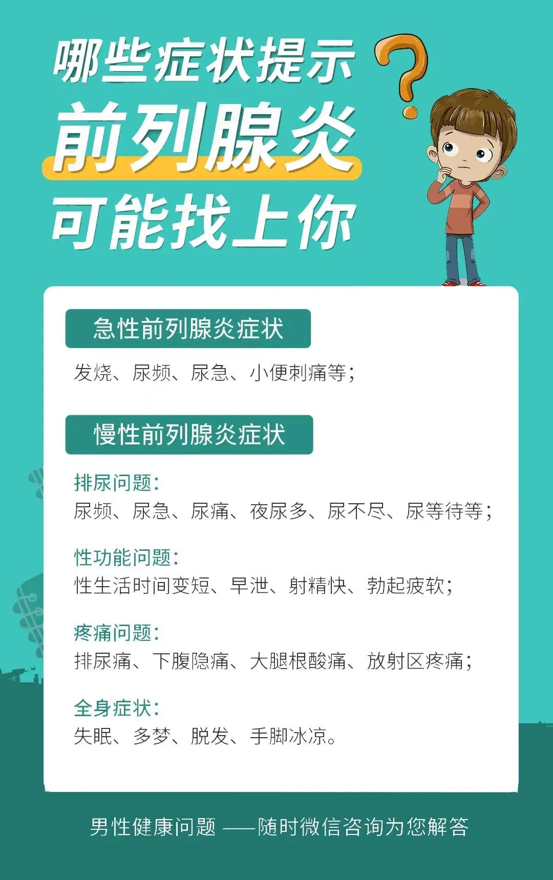4.检查有没有前列腺炎(尿频、尿急、尿痛、尿不尽、尿出血等等)