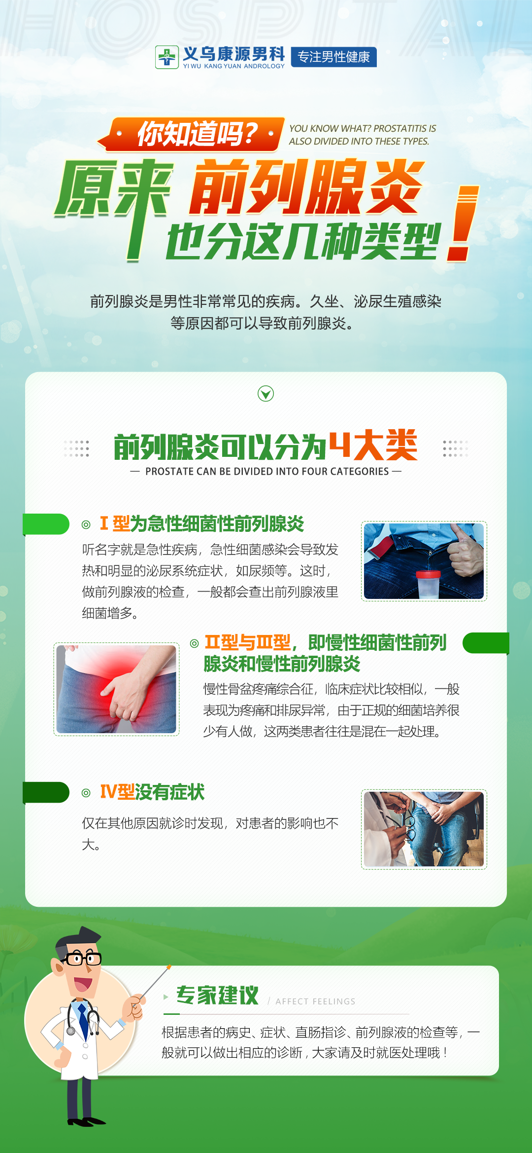 不过,也不是一切的患者都会出现这样的症状体现,首要仍是看类型。前列腺炎可分为四种自立类型: